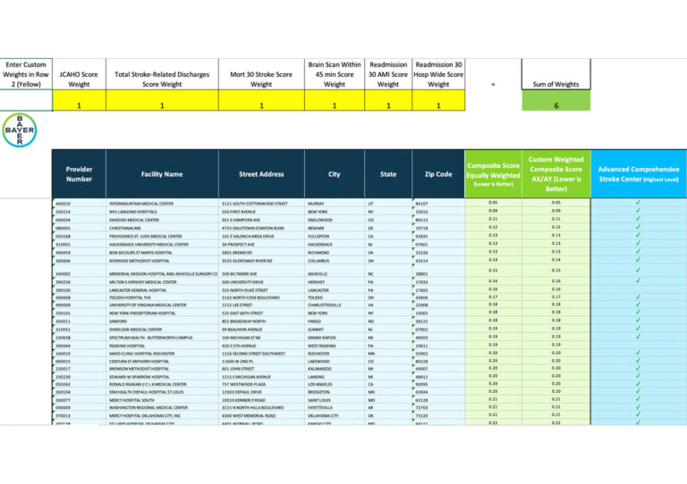 Forte brings custom solutions to each customer engagement. In this case, an easy-to-use file that weighs multiple hospital-level criteria (e.g., accreditations, case volume, quality measures, etc.) and allows user to set the weights.